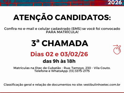 📢 ATENÇÃO, CANDIDATOS! 📌 O início da terceira chamada para: Ensino Médio Integrado Ensino Técnico Noturno 🗓️ Acontecerá nos dias 02/02 e 03/02, das 9h às 18h. ⚠️ Fiquem atentos às documentações necessárias