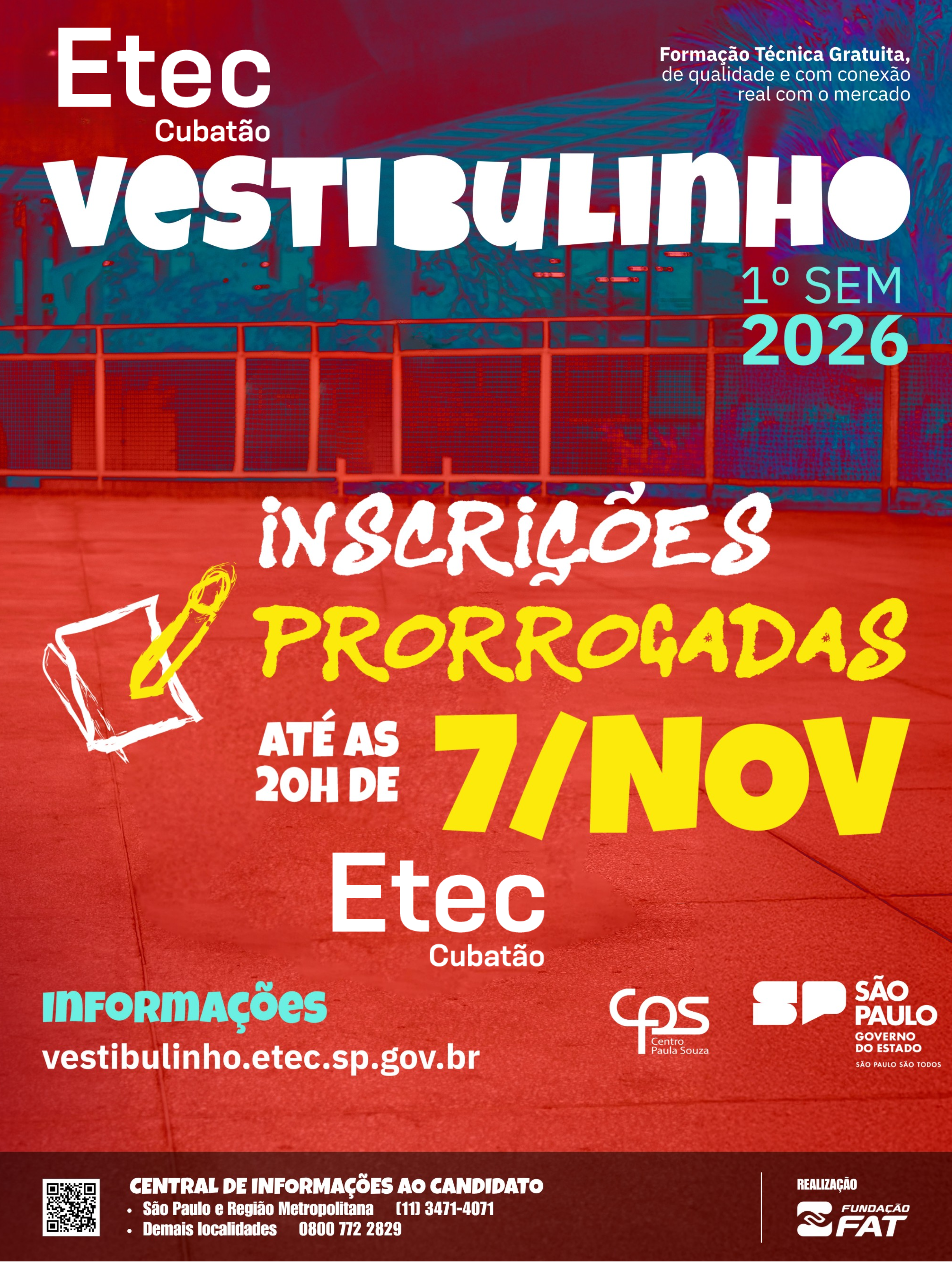 Etec de Cubatão (Sede) – Rua Tamoyo, 230 – Vila Couto, CEP 11510-160, Cubatão/SP.