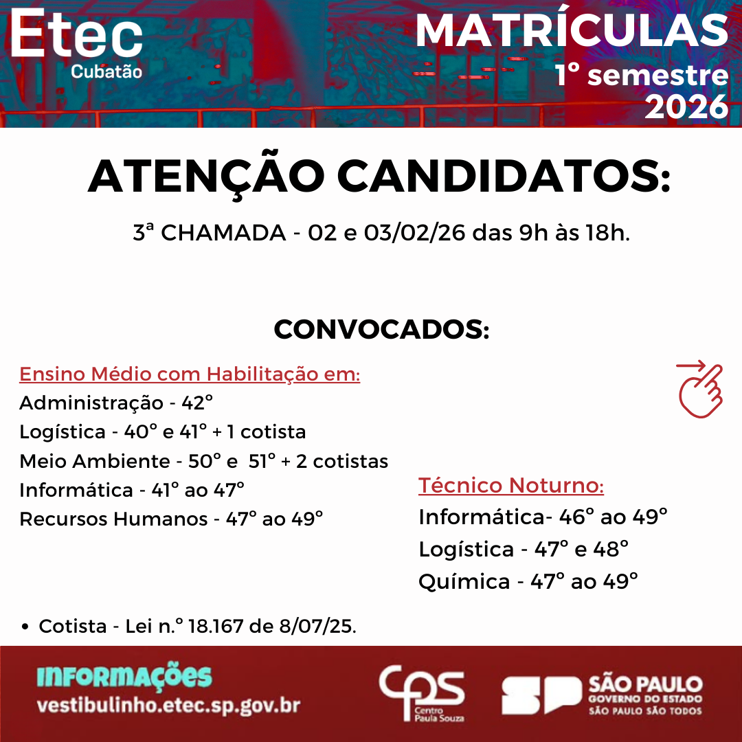 📢 ATENÇÃO, CANDIDATOS! 📌 O início da terceira chamada para: Ensino Médio Integrado Ensino Técnico Noturno 🗓️ Acontecerá nos dias 02/02 e 03/02, das 9h às 18h. ⚠️ Fiquem atentos às documentações necessárias